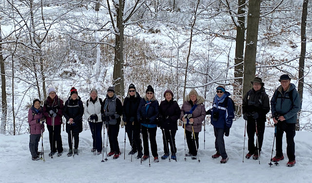 Despite the shadow of COVID lingering in the background, 13 hikers had a good outing today and enjoyed the conditions -- better than usual on the flat part today and lovely with fresh snow in the upper section.